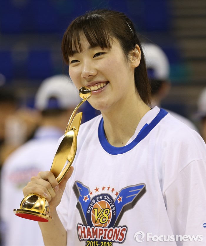 (부천=포커스뉴스) 20일 부천체육관에서 열린 2015-2016 여자프로농구 챔피언결정전에서 MVP로 선정된 우리은행 박혜진이 트로피를 들고 활짝 웃고 있다.