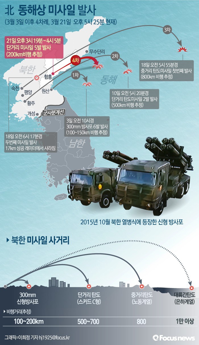 합동참모본부는 21일 "북한이 오늘 오후 3시 19분부터 4시 5분까지 함경남도 함흥 북방일대에서 동해상으로 단거리 발사체를 5발을 발사했다"면서 "이 발사체는 약 200km 정도를 비행한 것으로 파악된다"고 밝혔다.