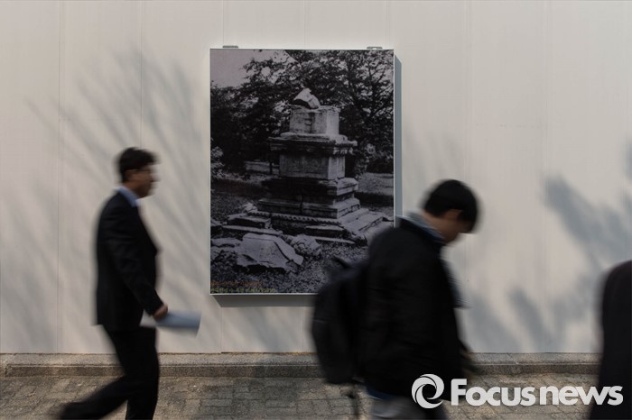(서울=포커스뉴스) 22일 오후 서울 경복궁 국립고궁박물관 앞뜰에서 국보 제101호 법천사지 지광국사탑 해체 보고식이 열렸다. 공사 펜스에 걸린 탑 사진 앞을 사람들이 지나고 있다.