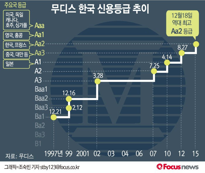 하향요인으로는 △진행 중인 구조개혁의 후퇴와 중장기 성장동력 약화 △정부 재정건전성의 약화 △북한 내부체제 붕괴, 군사적 충돌 등 북한관련 지정학적 리스크의 증가 등을 꼽았다.(서울=포커스뉴스) 지난해 12월 18일(현지시간) 국제신용평가기관 무디스가 우리나라 국가신용등급을역대최고 Aa2로 한단계 상향조정했다. 2015.12.20 조숙빈 기자