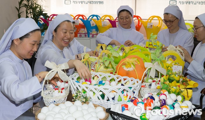 (대전=포커스뉴스) 부활절을 앞두고 23일 오전 대전 중구 가톨릭대학교 대전성모병원 원목팀 수녀들이 정성스럽게 꾸민 달걀을 바구니에 담고 있다. 이날 가톨릭대학교 대전성모병원 직원들은 생명의 탄생을 의미하는 부활 달걀 총 3000여개를 병동의 환자 및 보호자, 지역주민들에게 전달했다.