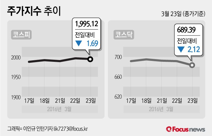 (서울=포커스뉴스) 23일 코스피지수는 전날 보다 0.08%(1.69포인트) 내린 1995.12에 장을 마쳤다. 코스닥지수는 전일 대비 0.31%(2.12포인트) 내린 689.39에 마감했다.