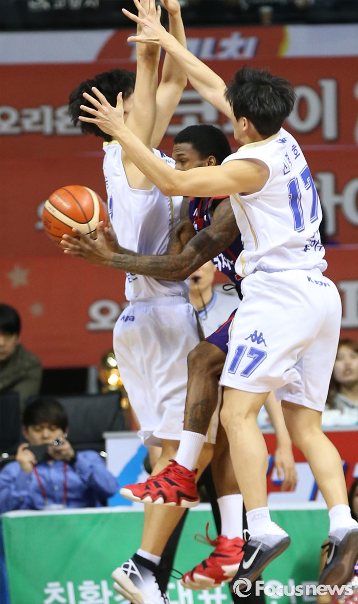 (고양=포커스뉴스) 23일 고양체육관에서 열린 2015-2016 프로농구 챔피언결정정 3차전 오리온-KCC경기에서 오리온 조 잭슨이 KCC 송교창과 신명호의 샌드위치 마크 속에서 패스하고 있다.