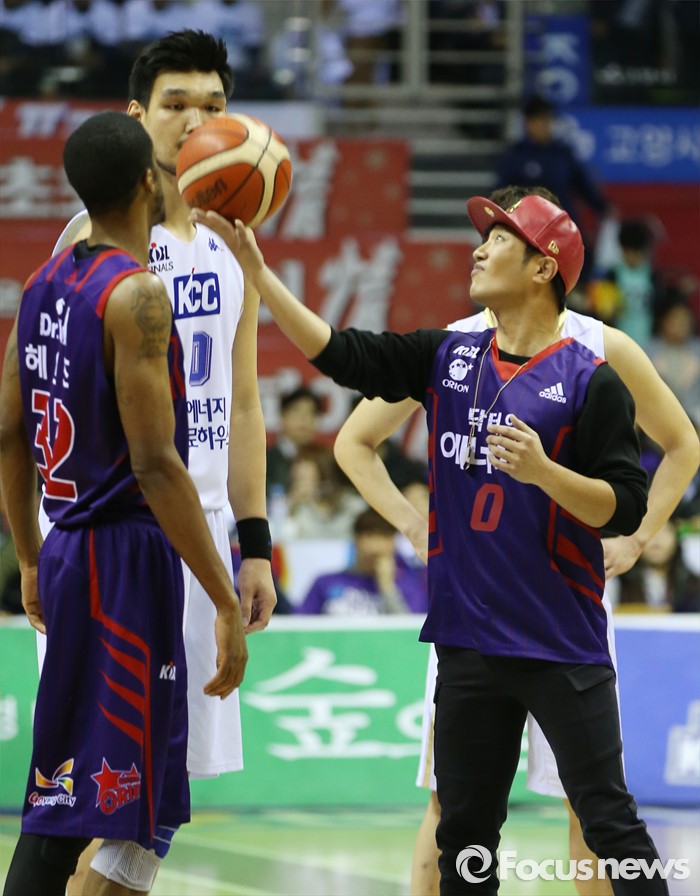 (고양=포커스뉴스) 23일 고양체육관에서 열린 2015-2016 프로농구 챔피언결정전 3차전 오리온-KCC경기에서 드라마 '태양의 후예'에 출연중인 탤런트 진구가 시구하고 있다.