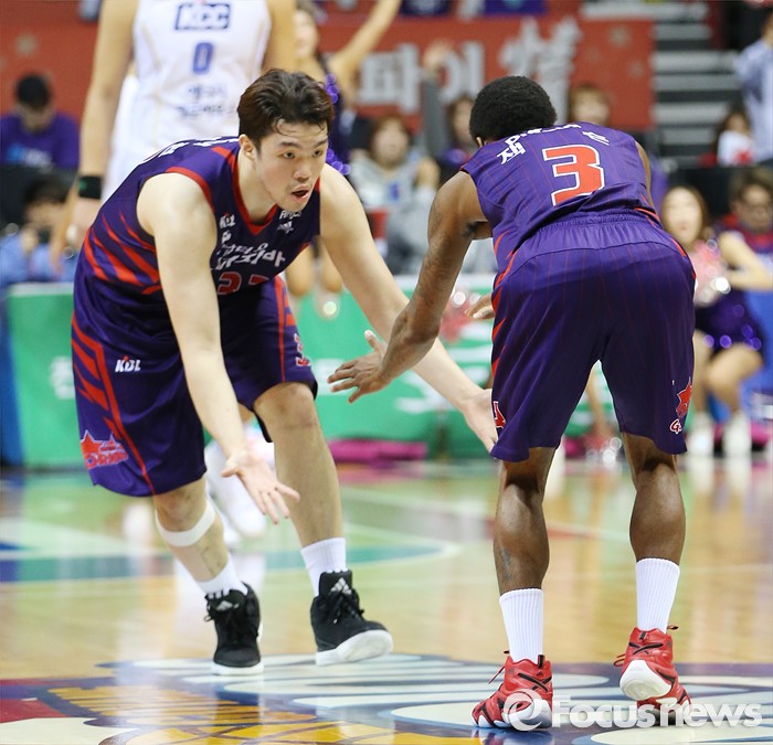 (고양=포커스뉴스) 23일 고양체육관에서 열린 2015-2016 프로농구 챔피언결정전 3차전 오리온-KCC경기에서 오리온 조 잭슨과 이승현이 득점에 성공한 후 로우파이브를 하고 있다.