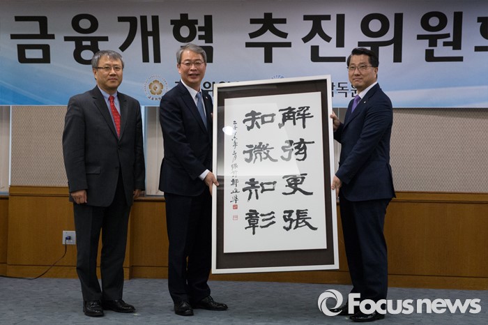 (서울=포커스뉴스) 24일 오전 서울 영등포구 여의도 금융감독원에서 열린 제2차 금융개혁추진위원회에서 진웅섭(오른쪽) 금융감독원장이 임종룡 금융위원장에게 '해현경장 지미지창' 글귀가 담긴 액자를 전달하고 있다. 맨 왼쪽 장범식 금융개혁추진위원장.