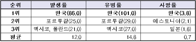 이에 비해, 우리나라의 결핵 발생률은 인구 10만 명 당 결핵 발생율 86명, 유병률 101.0명, 사망률 3.8명으로 1위를 차지했다.