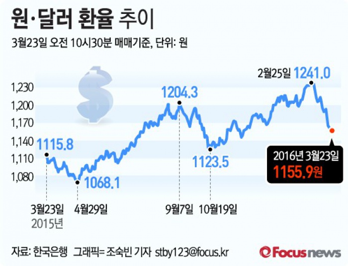 전문가들은 "글로벌 완화 정책에 따라 외국인 자금 유출입 규모도 빠르게 변할 것으로 보여 원화 가치 변동성은 더욱 커질 수 있다"고 진단하고 있다.(서울=포커스뉴스) 최근 원·달러 환율이 급등락을 반복하고 있다. 원화 가치는 2016년 첫 8주 동안 미국 달러화 대비 5.4% 절하되다가 이후 4주간은 6.6% 절상되는 양상을 보였다. 첫 8주간의 절하폭은 아르헨티나 페소화 가치에 절하폭인 16.0%에 이어 두 번째로 높은 수준이며, 이후 4주 간의 절상폭은 러시아 루블화(10.4%), 브라질 헤알화(9.2%)에 버금가는 수준이다.2016.03.23 조숙빈 기자