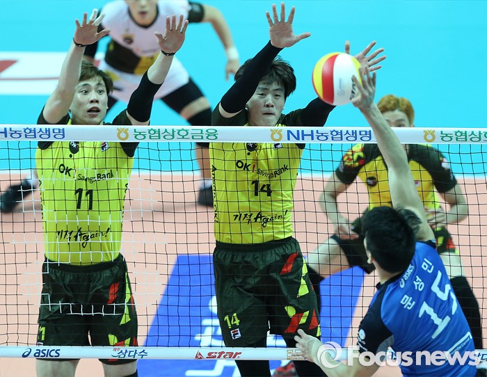 (안산=포커스뉴스) 24일 안산상록수체육관에서 열린 2015-2016 V-리그 남자부 챔피언결정전 4차전 OK저축은행-현대캐피탈 경기에서 OK저축은행 박원빈(11), 송희채가 현대캐피탈 문성민의 공격을 막기 위해 블로킹을 대고 있다.