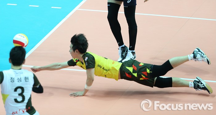 (안산=포커스뉴스) 24일 안산상록수체육관에서 열린 2015-2016 V-리그 남자부 챔피언결정전 4차전 OK저축은행-현대캐피탈 경기에서 OK저축은행 곽명우가 블로킹에 맞고 떨어지는 볼을 살리려고 몸을 날리고 있다.