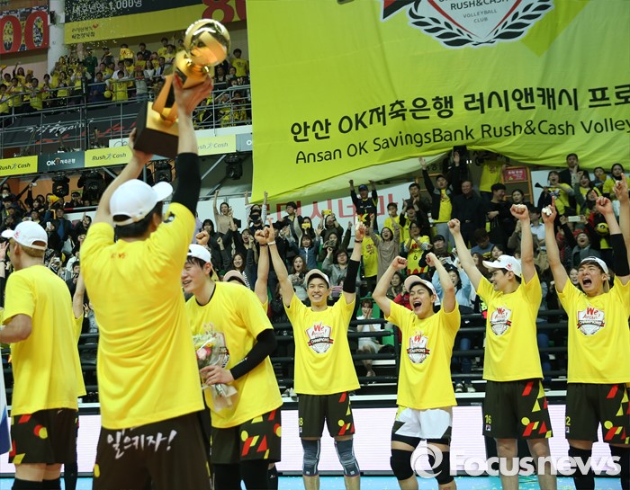 (안산=포커스뉴스) 24일 안산상록수체육관에서 열린 2015-2016 V-리그 남자부 챔피언결정전에서 현대캐피탈을 3승1패로 물리치고 2연패를 달성한 OK저축은행 강영준이 우승 트로피를 높이 들고 선수들과 환호하고 있다.