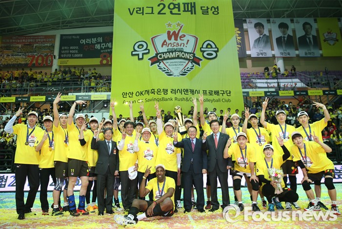 (안산=포커스뉴스) 24일 안산상록수체육관에서 열린 2015-2016 V-리그 남자부 챔피언결정전에서 현대캐피탈을 3승1패로 물리치고 2연패를 달성한 OK저축은행 김세진 감독을 비롯한 선수들이 구자준 배구연맹 총재등 관계자들과 우승 트로피를 들고 기념사진을 찍고 있다.