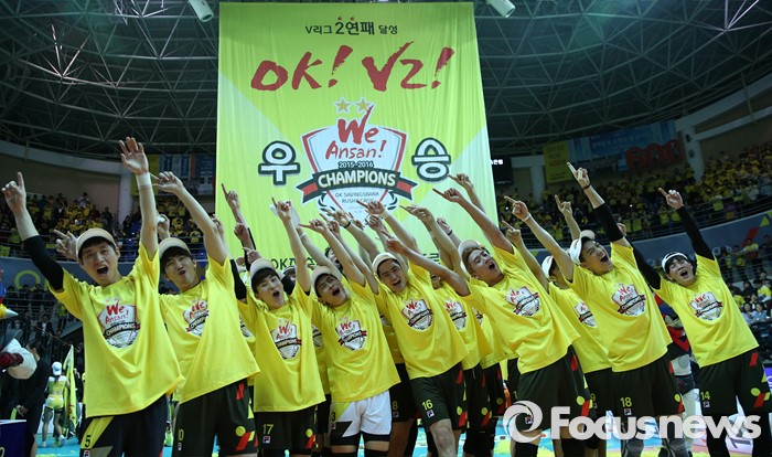 (안산=포커스뉴스) 24일 안산상록수체육관에서 열린 2015-2016 V-리그 남자부 챔피언결정전에서 현대캐피탈을 3승1패로 물리치고 2연패를 달성한 OK저축은행 선수들이 축하 현수막 앞에서 환호하고 있다.