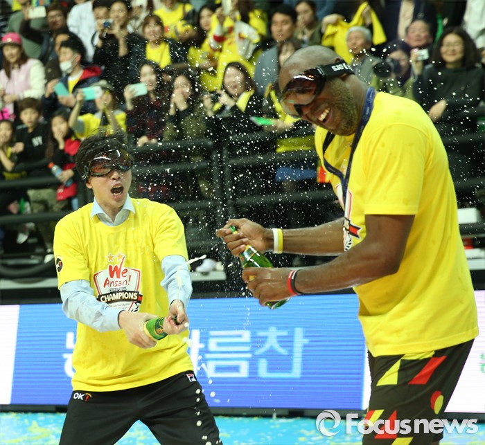 (안산=포커스뉴스) 24일 안산상록수체육관에서 열린 2015-2016 V-리그 남자부 챔피언결정전에서 현대캐피탈을 3승1패로 물리치고 2연패를 달성한 OK저축은행 김세진 감독이 시몬에게 샴페인을 뿌리고 있다.