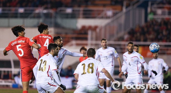 (안산=포커스뉴스) 24일 오후 경기도 안산 와스타디움에서 열린 2018 러시아 월드컵 아시아 2차 예선 7차전 대한민국 대 레바논 경기에서 양 팀 선수들이 볼다툼을 하고 있다.