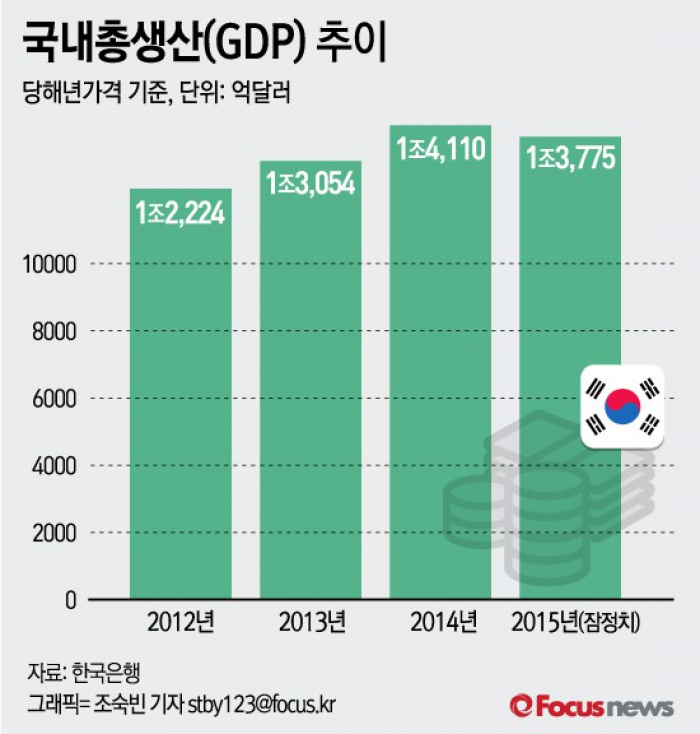 (서울=포커스뉴스) 25일 한국은행이 발표한 ‘2014년 국민계정(확정) 및 2015년 국민계정(잠정)’에 따르면 지난해 1인당 국내총생산(GDP)은 1조 3775억달러(잠정)로 집계됐다.