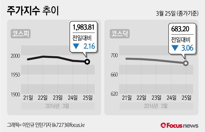(서울=포커스뉴스) 25일 코스피지수는 전날 보다 0.11%(2.16포인트) 내린 1983.81에 장을 마쳤다. 코스닥지수는 전일 대비 0.45%(3.06포인트) 내린 683.20에 마감했다.