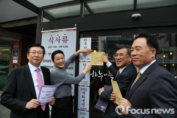 (서울=포커스뉴스) 한견표 한국소비자원 원장과 김학현 공정거래위원회 부위원장은 25일 소비자단체 관계자들과 함께 서울 중구 한국외식업중앙회 본부에서 외식업 종사자들과 간담회를 갖고, 예약부도(No-Show)로 인한 업계의 애로사항과 의견을 수렴했다.