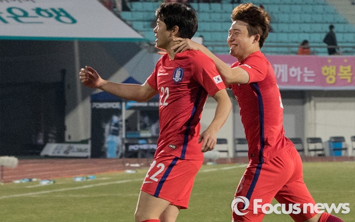 (이천=포커스뉴스) 25일 오후 경기 이천종합운동장에서 열린 KEB하나은행 초청 올림픽대표 대한민국과 알제리의 친선경기에서 전반전 한국 권창훈이 첫 득점을 성공하자 동료들과 기뻐하고 있다.