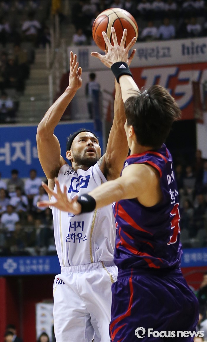 (고양=포커스뉴스) 25일 고양체육관에서 열린 2015-2016 프로농구 챔피언결정전 4차전 오리온-KCC경기에서 KCC 전태풍이 오리온 장재석의 블록위로 점프슛을 쏘고 있다.