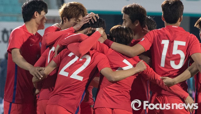 (이천=포커스뉴스) 25일 오후 경기 이천종합운동장에서 열린 KEB하나은행 초청 올림픽대표 대한민국과 알제리의 친선경기에서 전반전 한국 권창훈이 첫 득점을 성공하자 동료들과 기뻐하고 있다.