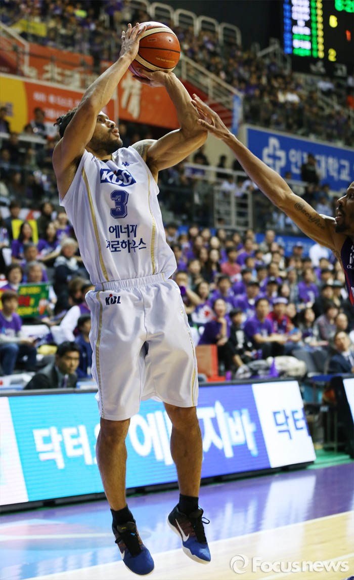 (고양=포커스뉴스) 25일 고양체육관에서 열린 2015-2016 프로농구 챔피언결정전 4차전 오리온-KCC경기에서 KCC 전태풍이 오리온 헤인즈의 수비 위로 점프슛을 쏘고 있다.