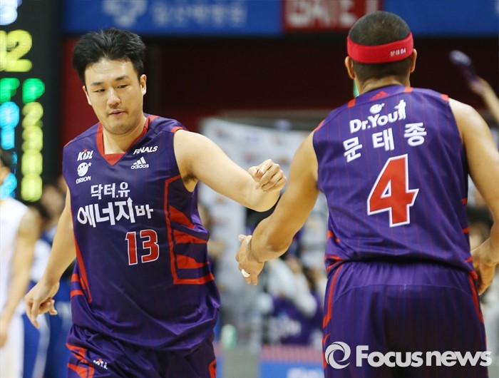 (고양=포커스뉴스) 25일 고양체육관에서 열린 2015-2016 프로농구 챔피언결정전 4차전 오리온-KCC경기에서 득점한 오리온 김동욱이 문태종과 손을 마주치고 있다.