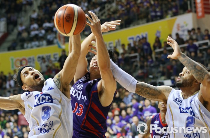 (고양=포커스뉴스) 25일 고양체육관에서 열린 2015-2016 프로농구 챔피언결정전 4차전 오리온-KCC경기에서 KCC 전태풍, 에밋이 오리온 김동욱과 바운드된 볼을 다투고 있다.