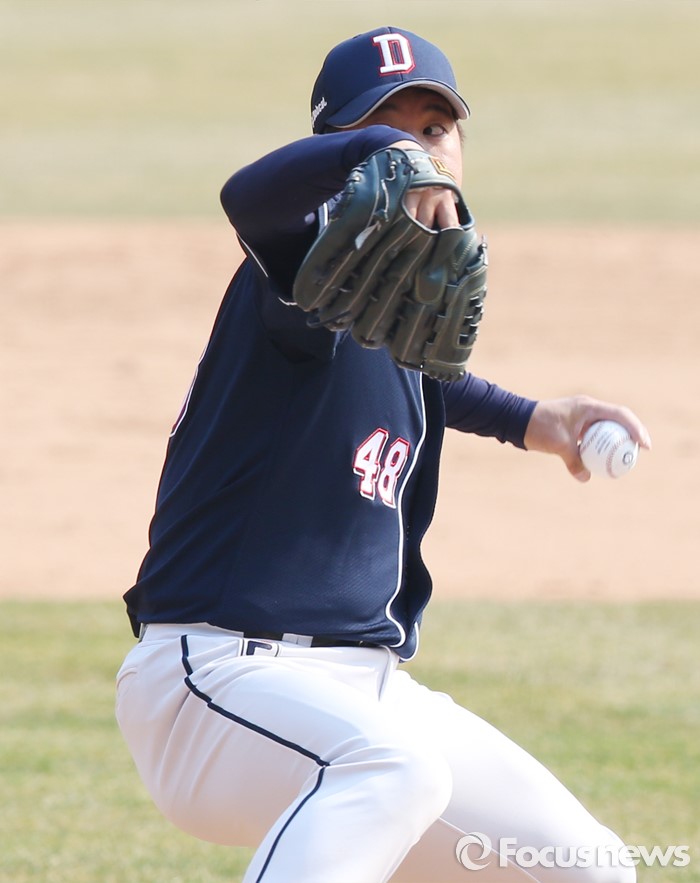 (서울=포커스뉴스) 27일 서울 잠실구장에서 열린 2016프로야구 시범경기 두산-LG 경기에서 두산 투수 이현승이 9회말에 등판해 승리를 지키는 투구를 하고 있다.