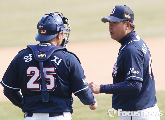 (서울=포커스뉴스) 27일 서울 잠실구장에서 열린 2016프로야구 시범경기 두산-LG 경기에서 두산 마무리 투수 이현승이 세이브를 올리고 포수 양의지와 주먹을 마주치고 있다.