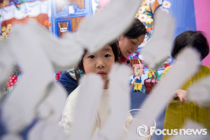 (서울=포커스뉴스) 28일 오전 서울 송파구 롯데백화점 잠실점 에비뉴엘 아트홀에서 열린 '러블리 레테' 전시회에서 프랑스 작가 나탈리 레테가 어린이들과 라이브페인팅을 하고 있다.