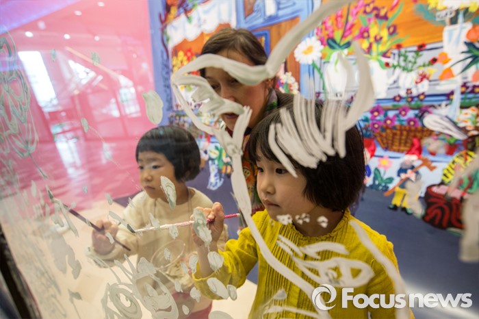 (서울=포커스뉴스) 28일 오전 서울 송파구 롯데백화점 잠실점 에비뉴엘 아트홀에서 열린 '러블리 레테' 전시회에서 프랑스 작가 나탈리 레테가 어린이들과 라이브페인팅을 하고 있다.