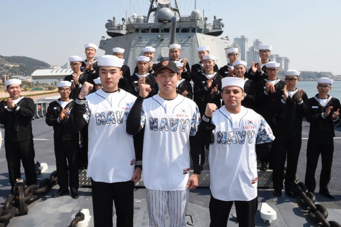 롯데는 28일 해군작전사령부와 함께 상호협력계획을 발표하고 홈경기 관람권 기증식과, 해군 NAVY 유니폼 공개 행사를 열었다. 이 자리에는 이창원 대표와 이기식 사령관이 참석했다.