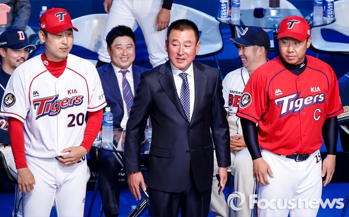 (서울=포커스뉴스) 28일 오후 서울 용산구 브루스퀘어 삼성카드홀에서 열린 '2016 타이어뱅크 프로야구 미디어데이 & 팬페스트' 행사에 참석한 기아 타이거즈 김기태 감독(가운데)과 이범호, 윤석민이 포즈를 취하고 있다.