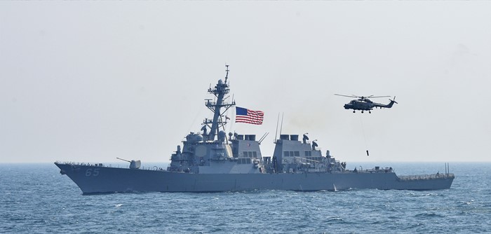 (서울=포커스뉴스) 제1회 서해 수호의 날인 25일 서해에서 열린 한·미 연합훈련에서 링스 해상작전헬기와 미국 이지스구축함 벤폴드함이 대잠훈련을 하고 있다. <사진제공=해군>