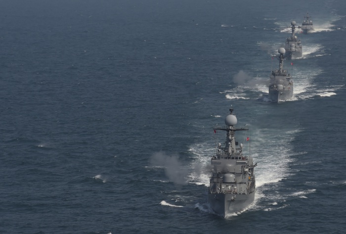 (서울=포커스뉴스) 제1회 서해 수호의 날인 25일 서해에서 열린 한·미 연합훈련에서 호위함 제주함(제일 앞)등 함정들이 함포 일제사격을 하고 있다. <사진제공=해군>