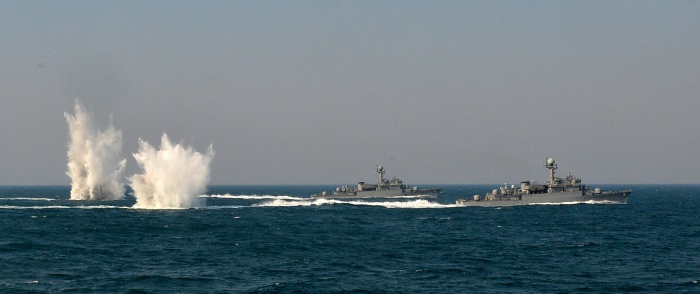 (서울=포커스뉴스) 제1회 서해 수호의 날인 25일 서해에서 열린 한·미 연합훈련에 참가한 익산함(우측)과 신성함(좌측)이 폭뢰투하 훈련을 하고 있다. <사진제공=해군>