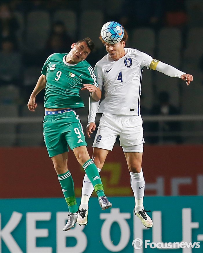 (고양=포커스뉴스) 28일 오후 경기 고양종합운동장에서 열린 올림픽축구대표팀 2차 평가전 대한민국과 알제리의 경기에서 한국 송주훈과 알제리 오사마가 볼을 다투고 있다.