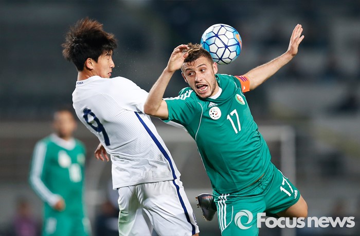 (고양=포커스뉴스) 28일 오후 경기 고양종합운동장에서 열린 올림픽축구대표팀 2차 평가전 대한민국과 알제리의 경기에서 한국 김현과 알제리 체리피가 공중볼을 다투고 있다.