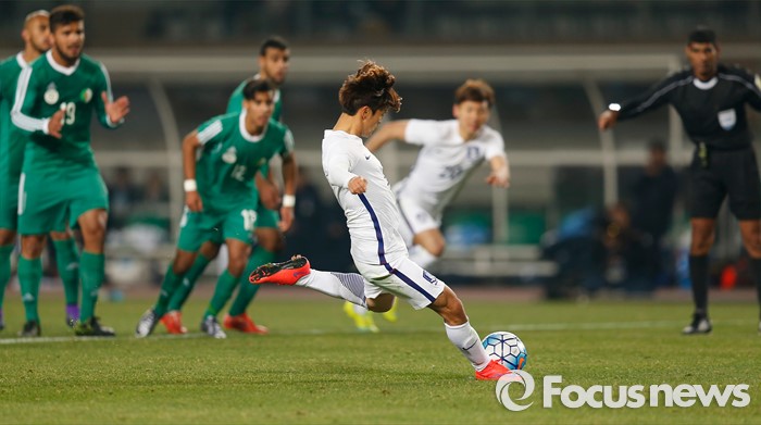 (고양=포커스뉴스) 28일 오후 경기 고양종합운동장에서 열린 올림픽축구대표팀 2차 평가전 대한민국과 알제리의 경기에서 한국 문창진이 후반전 패널트킥으로 팀 세번째 골을 넣고 있다.