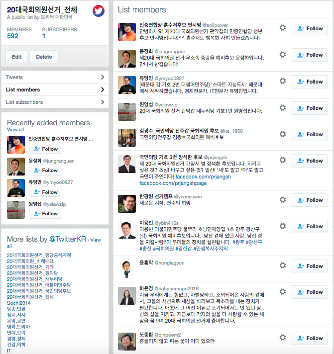 이날 공개된 후보자 계정은 총 592개이며 정당별로는 새누리당 178명, 더불어민주당 191명, 국민의당 90명, 정의당 30명, 기타정당 및 무소속 103명이다. 비례대표 후보 43명의 트위터 계정 리스트도 별도 제공된다. 트위터 코리아가 공개한 후보자 계정 리스트 페이지에서는 각 후보자들의 계정을 정당별로 확인할 수 있을 뿐 아니라 개별 후보자 계정에서 올리는 트윗들도 실시간으로 한눈에 모아 볼 수 있다. 현재 리스트 상에는 주요 정당에서 공천이 확정된 후보자들 중 트위터 계정을 보유한 후보만 정리돼 있다.