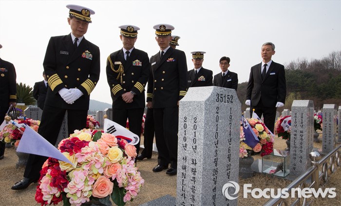 (대전=포커스뉴스) 다케이 도모히사 일본 해상막료장(해군참모총장)이 29일 오전 대전 유성구 국립대전현충원을 방문, 천안함 46용사 묘역을 둘러보고 있다.