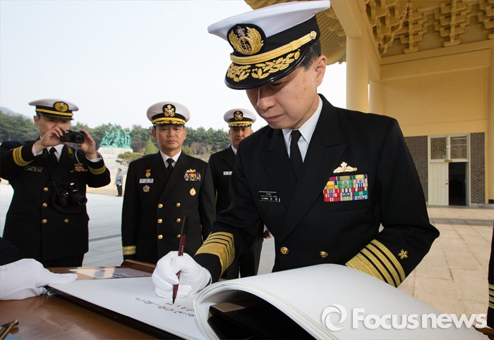 (대전=포커스뉴스) 다케이 도모히사 일본 해상막료장(해군참모총장)이 29일 오전 대전 유성구 국립대전현충원을 방문, 현충탑에서 참배를 하마치고 방명록을 작성하고 있다.