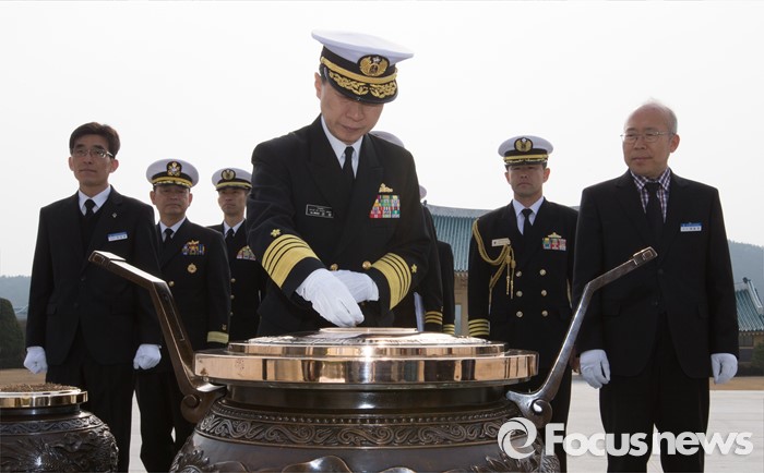(대전=포커스뉴스) 다케이 도모히사 일본 해상막료장(해군참모총장)이 29일 오전 대전 유성구 국립대전현충원을 방문, 현충탑에서 참배를 하고 있다.