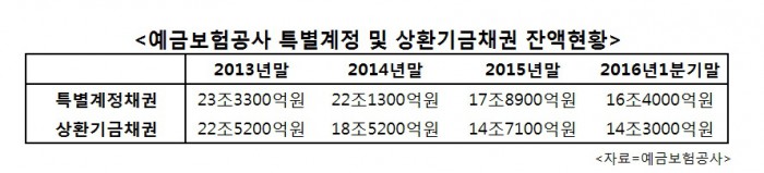 상환기금채권 잔액은 2013년말 22조5200억원에서 2016년 1분기말 14조3000억원으로 줄었다.<자료제공=예금보험공사>