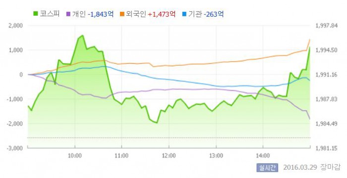 이날 코스피는 전일 대비 0.22% 상승한 1986.93으로 장을 시작했다. 이후 지수는 외국인의 매수세에 1990선을 넘어섰다.