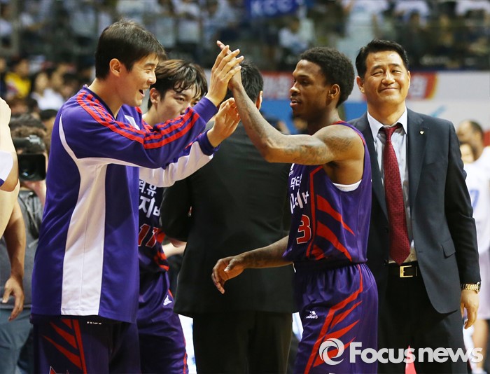 (고양=포커스뉴스) 29일 고양체육관에서 열린 2015-2016 프로농구 챔피언결정전 6차전 오리온-KCC 경기에서 작전타임에 벤치로 들어오는 오리온 조 잭슨과 김도수가 하이파이브를 하고 있다. 추일승 감독은 흐뭇한 미소를 짓고 있다.
