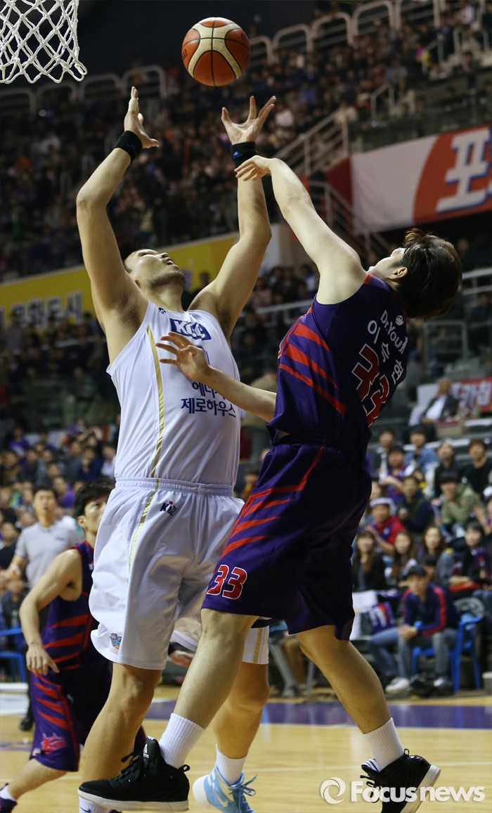 (고양=포커스뉴스) 29일 고양체육관에서 열린 2015-2016 프로농구 챔피언결정전 6차전 오리온-KCC 경기에서 KCC 하승진이 오리온 이승현과 리바은드 다툼을 벌이고 있다.