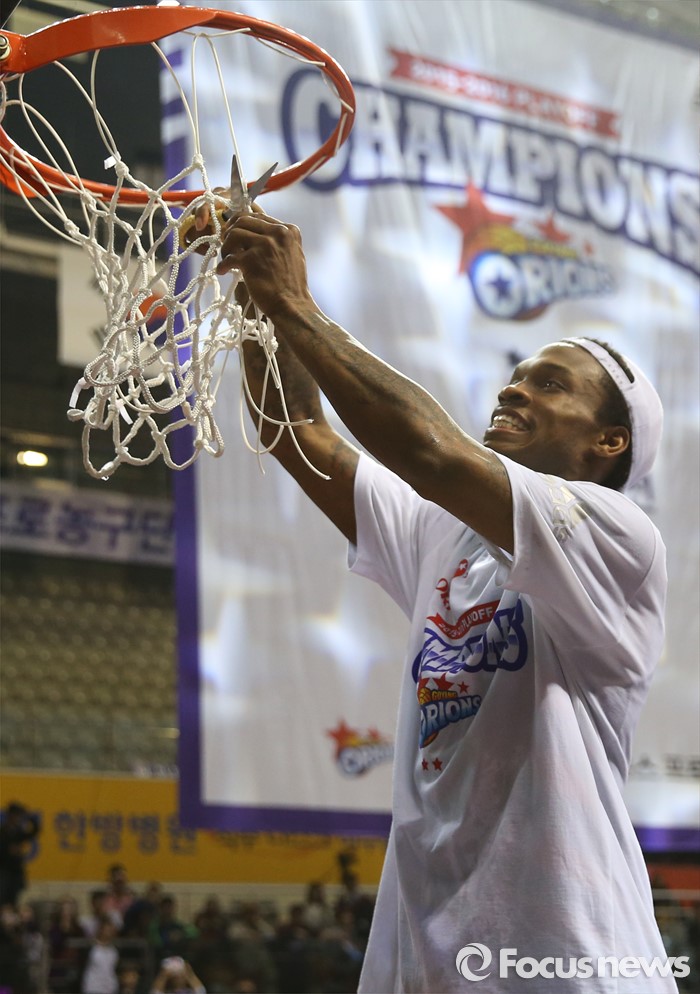 (고양=포커스뉴스) 29일 고양체육관에서 열린 2015-2016 프로농구 챔피언결정전에서 KCC를 4승2패로 물리치고 우승을 차지한 오리온의 조 잭슨이 골망을 자르고 있다.