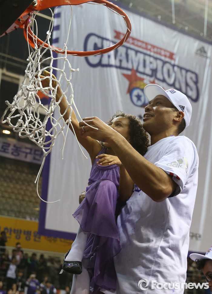 (고양=포커스뉴스) 29일 고양체육관에서 열린 2015-2016 프로농구 챔피언결정전에서 KCC를 4승2패로 물리치고 우승을 차지한 오리온의 문태종이 딸과 함께 골망을 자르고 있다.